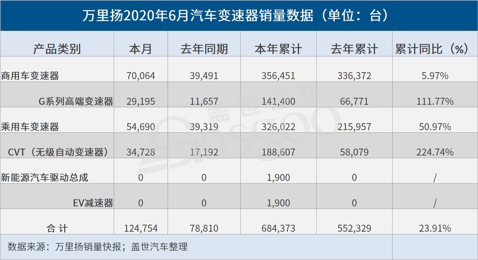 7月11日,万里扬发布2020年6月汽车变速器销量快报。报告显示,万里扬6月变速器销量达124,754台,同比增长58.3%,上半年累计销量达684,373台,同比增长23.9%。