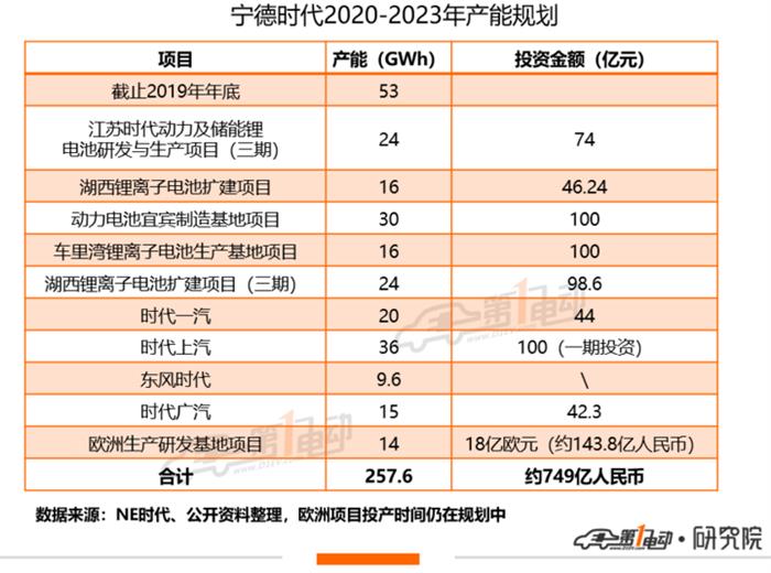 再加上以往规划的与上汽、广汽、一汽、东风合作规划的产能,据第一电动网不完全统计,加上已有的53GWh,宁德时代2020-2023年预计投产的项目产能已达257.6GWh。