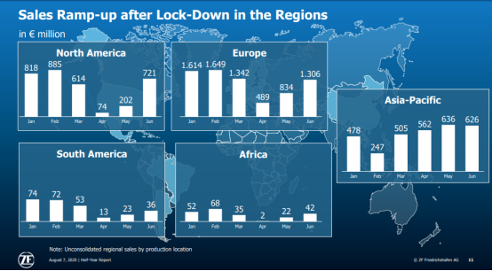 采埃孚预计,今年下半年全球各地市场环境仍将十分复杂。尽管欧洲目前正显示出复苏的迹象,但由于汽车出口量下降和日益严格的排放标准,欧洲很可能在未来几年成为最艰难的市场区域。美洲由于目前新冠肺炎疫情感染人数众多,发展也极具不确定性。中国和亚洲是目前最有前景的市场,该地区的业务正在强劲复苏,并助力集团销售额的增长。
