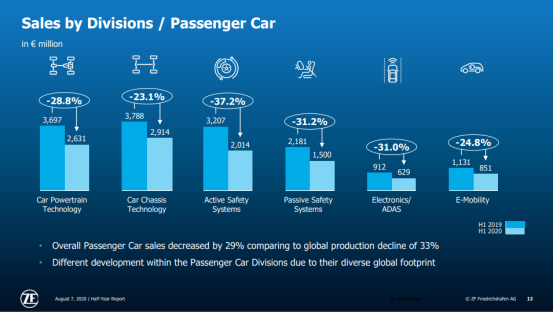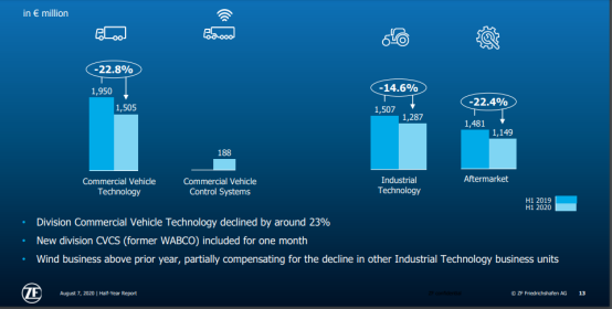 上半年,采埃孚公司主营业务——汽车动力总成、底盘零部件、主动安全和商用车业务随着全球汽车销量的下跌也未能增长。其中:
