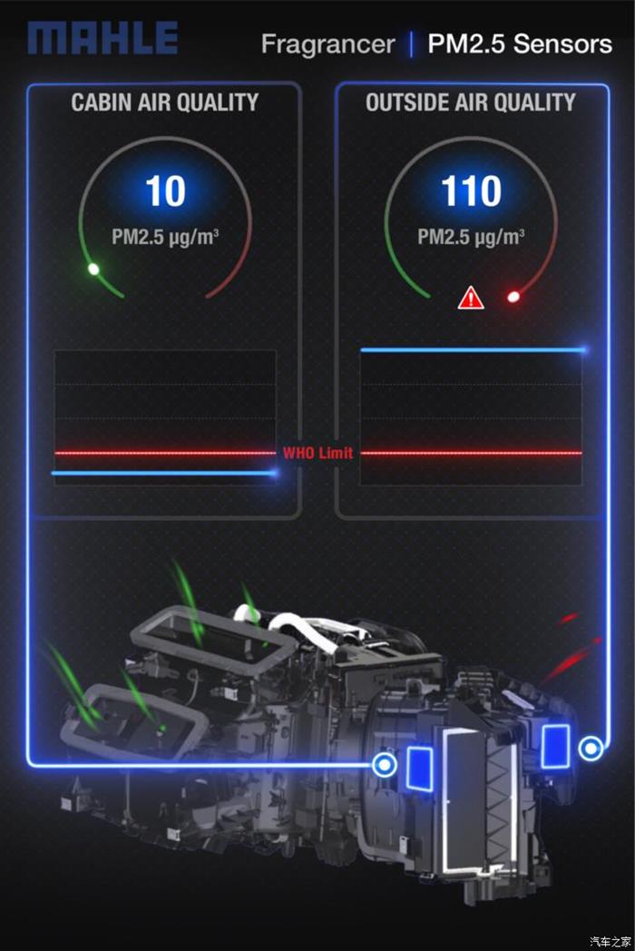 该技术理念的另一个关键在于全新开发的具有更高过滤效率的细颗粒物空调滤。马勒方面称,除创新的传感器理念以外,马勒开发的新一代细颗粒物空调滤在整个寿命周期内都将展现出稳定而高效的杂质隔离能力,从而长久保持车厢空气清洁,并将细小颗粒物、固体微粒,还是有害气体、环境异味拒之车外。常见颗粒物包括前车扬起的刹车粉尘、燃油煤烟、橡胶轮胎屑等等。集成在马勒智能空调中的传感器同时也有助于延长滤芯的使用寿命。此外,该空调滤还能使空调内部零部件免于暴露在脏空气中。