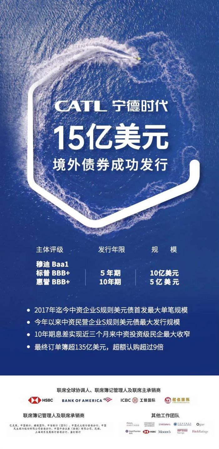 日前,宁德时代宣布称,成功发行15亿美元高级双期限固息债券。本次发行的担保人评级为Baa1/BBB+/BBB+(穆迪/标普/惠誉),债项评级Baa1/BBB+/-(穆迪/标普/惠誉),5年期和10年期融资规模达10亿美元和5亿美元,票息分别为1.875%和2.625%,定价息差为T+165基点和T+200基点,较初始价格指引分别收窄50基点和55基点,最终订单簿超过135亿美元,超额认购超过9倍。