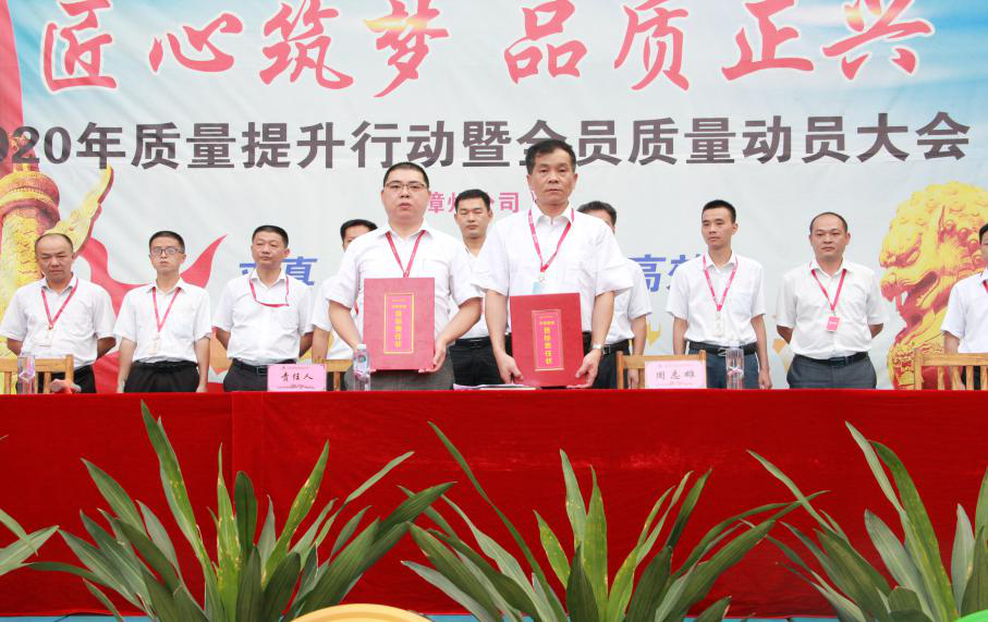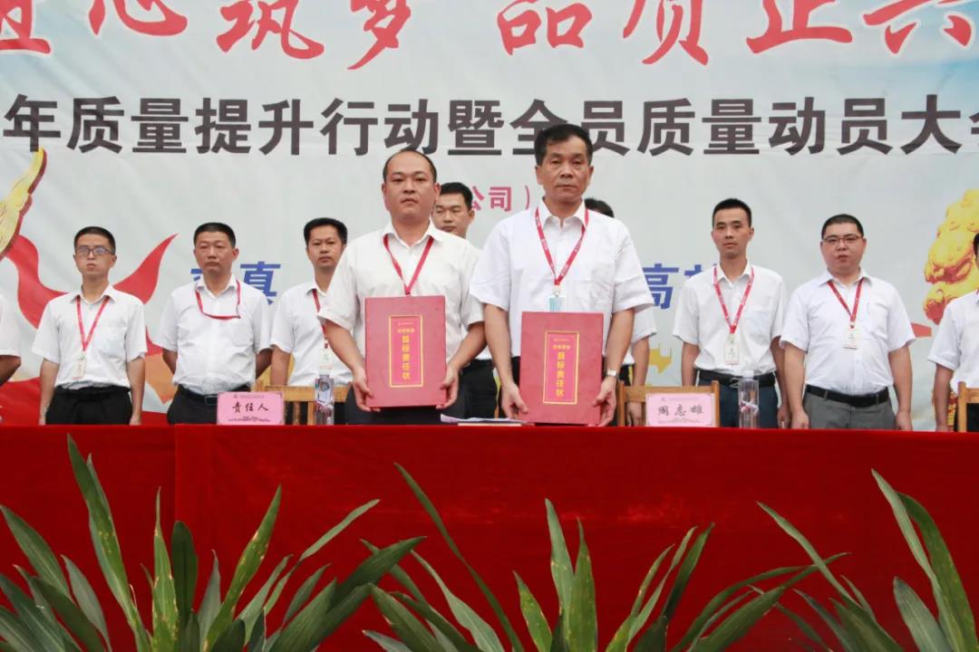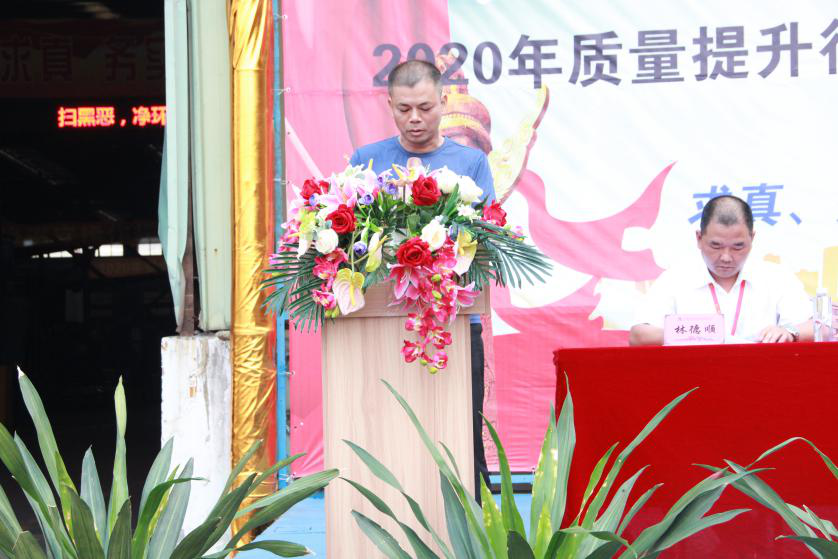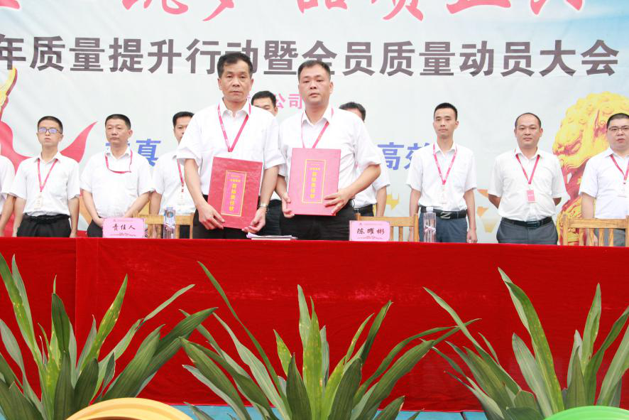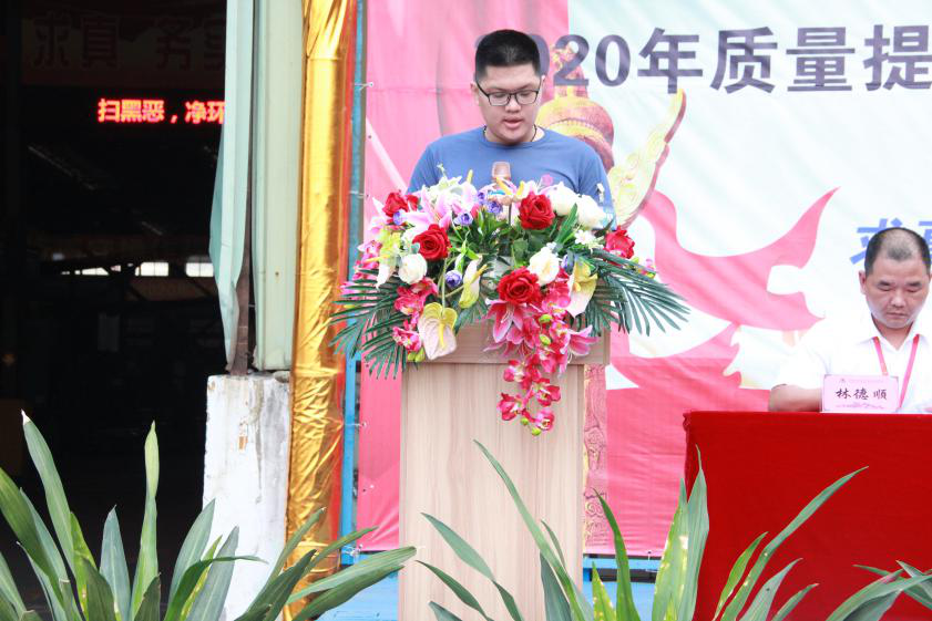 承诺就是责任和担当。会上生产、质量副总周志雄、生产部经理赖宏伟、质检部经理赖志明、技术部经理傅荣辉、设备部经理林文武及一线员工代表依次上台做质量动员及质量承诺。