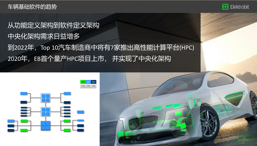 基础软件助力车企电子电气架构更新 邹露君指出,目前大多车企希望将软件的控制权掌握在自己手中,要做到这一点,就必须进行电子电气架构的革新。“我们看到现在的架构正在向中央化转变,预计2022年前十大汽车厂商中会有7家推出基于下一代架构的高性能计算平台(HPC),即将上市的大众ID.3则是传统车企中基于中央化架构的首款量产产品。”