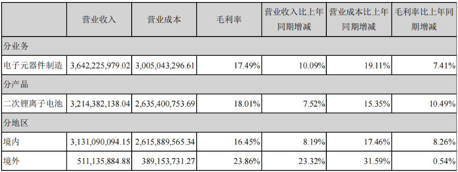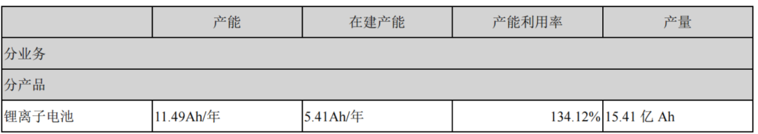其中,锂离子电池营收32.14亿元,同比增7.52%,毛利率增至18%;产量为15.41亿Ah,产能利用率为134.12%。
