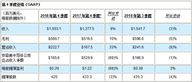 安森美半导体公司称,2018年第4季度总收入为1503.1百万美元,较去年同一季度上升约9%。2018年第4季度的收入较2018年第3季度下跌约3%。按现时产品订单趋势、未完成订单水平和估计周转水平,本公司预计2019年第1季度的收入总额将约为1365百万美元至1415百万美元。2019年第1季度 [详细]