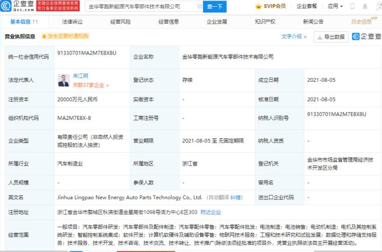 根据相关企业信息显示,金华零跑新能源汽车零部件技术有限公司法定代表人为朱江明,注册资本2亿元人民币,经营范围包含:电池制造、电池销售、电动机制造、电机及其控制系统研发以及智能控制系统集成等。
