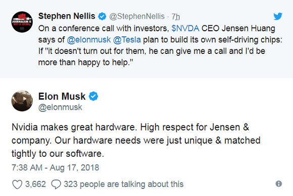 特斯拉尚未对此置评,不过马斯克在英伟达电话会议后在Twitter上发布了一条推文,“英伟达开发出了很棒的硬件。我对英伟达及黄仁勋表示非常尊敬。但我们的硬件需求非常独特,需要与我们的软件紧密结合。”