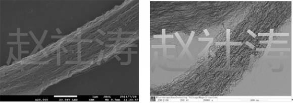 (陈列式薄壁小管径碳纳米管的扫描电镜和低倍透射电镜照片,具有陈列的平行排列结构)