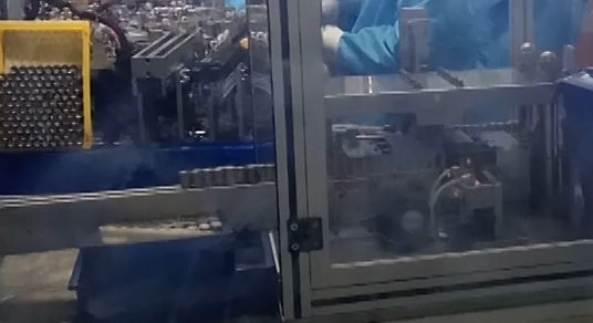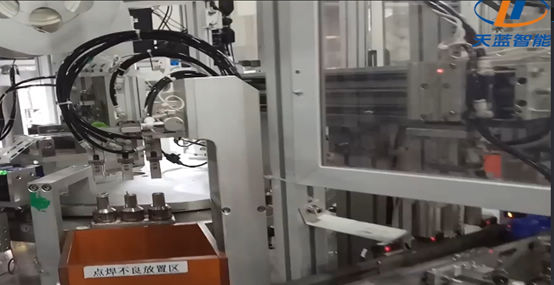 电芯点底焊--既电芯底部极耳与钢壳焊接的过程。天蓝智能的点底焊机,该设备首创2次焊接,采用凸轮连杆传动方式,可实现无间断旋转传送,设备搭载的拉力测试环节,可有效防止不良品流入下一工序。
