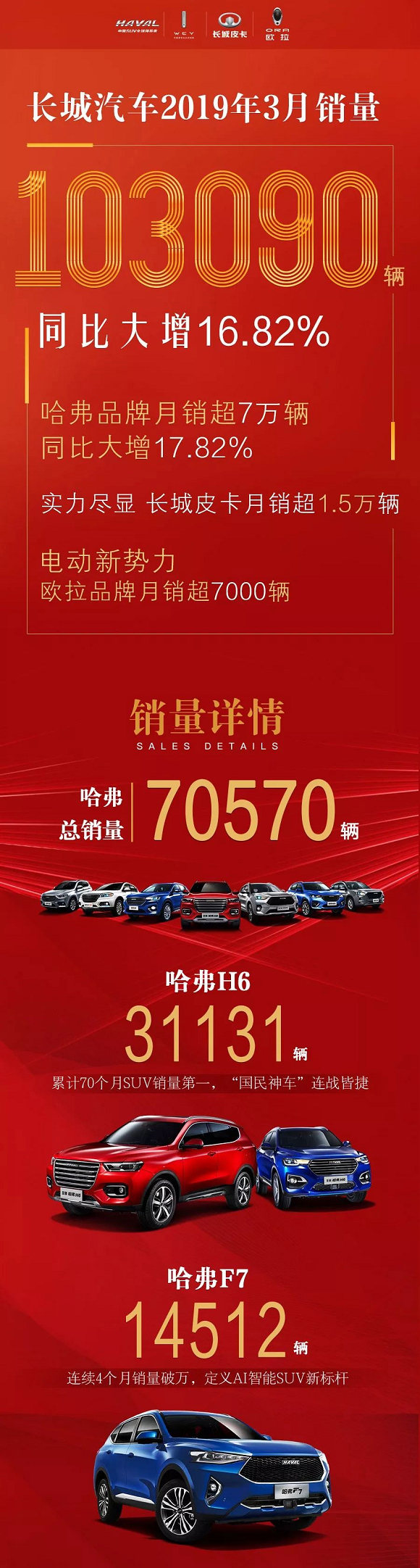 涨涨涨!长城汽车2019年3月销量公布,总销量达103090辆,环比劲增49%,同比大增16.82%!在国内汽车市场增长乏力的大环境下,长城汽车保持强劲增长态势,今年第一季度累计销量已达28.38万辆!