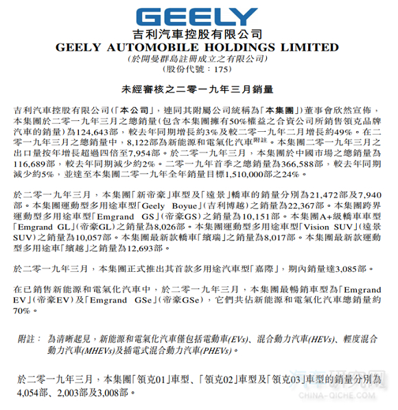 4月8日,吉利汽车发布2019年3月业绩公告,该集团2019年3月的总销量(包含集团拥有50%权益的合营企业所销售领克品牌汽车的销量)为124643部,较去年同期增长约3%,较2019年2月环比增长约49%。