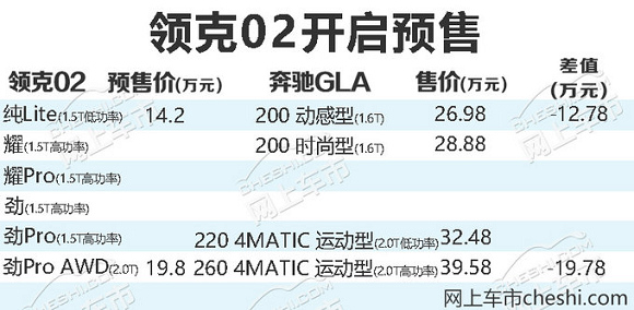 2018年3月26日、领克旗下第二款量产车型领克 02在荷兰阿姆斯特丹全球首发,该车定位一款高能轿跑SUV,将于下月正式上市。5月20日,领克02正式开启预售,共推6款配置车型,价格区间为14.2万元-19.8万元。相比于被领克视为技术对标的奔驰GLA的顶配价格,领克02便宜了19.78万元,但配置上毫不逊色。