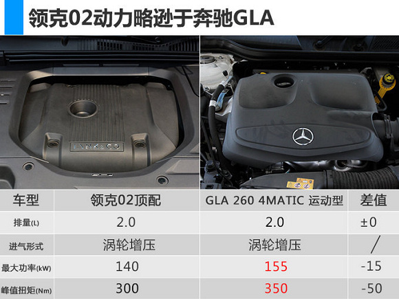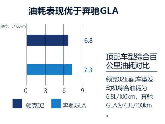 相比于奔驰GLA,领克02在油耗方面的表现也很强势。1.5T低功率发动机综合油耗低至6.0L/100km,高功率发动机综合油耗为6.2L/100km,相比于奔驰GLA 1.6T(低/高功率)发动机分别低0.5L/100km、0.3L/100km。另外,2.0T发动机综合油耗为6.8L/100km,相比奔驰GLA低0.5L/100km。