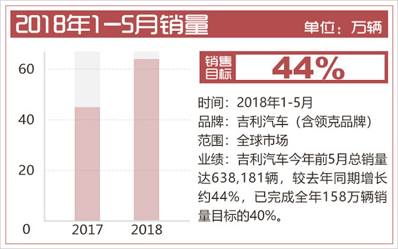 根据官方公布的消息,吉利汽车(含领克品牌汽车销量)5月份单月销量达123,068辆,同比增长61%。至此,今年前5月吉利汽车总销量达638,181辆,较去年同期增长约44%。