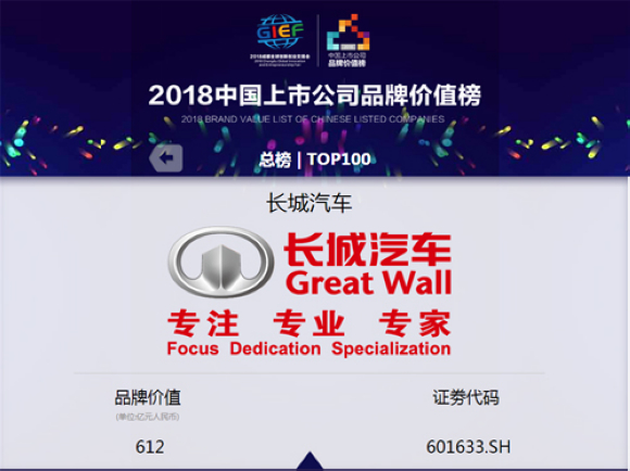 5月19日,“2018中国上市公司品牌价值与创新论坛”成功举行,在众多海内外权威学者和世界500强高管的见证下,“2018中国上市公司品牌价值榜“正式发布。通过科学、公正、公开的评选,长城汽车以612亿元的品牌价值入列百强榜,在自主车企的上市公司中长城汽车品牌价值位居第一。