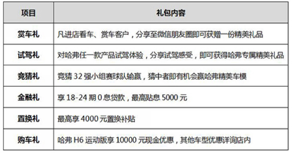 本次优惠购车活动主要从六个方面进行,大致可以分为三类。首先是体验类,包含赏车礼和试驾礼,凡是前来赏车或体验哈弗产品的消费者,只需转发朋友圈或分享试驾感受,便可以获得哈弗提供的精美礼品。其次是互动类,包含竞猜礼这一项,无论是车主还是准车主,只要参与竞猜32强小组赛球队输赢,猜中者就有机会获得哈弗车模,温馨提醒本届世界杯的第一场小组赛是在6月14日,千万不要错过。最后是优惠类,包含金融礼、置换礼以及购车礼,对于消费者最关心的优惠问题,哈弗品牌这次也是诚意满满,0息贷款可享18-24期,置换补贴最高可得4000元,打算购入哈弗H6运动版的准车主可以获得立减10000元的现金优惠。毫无疑问,六大礼包让哈弗品牌车型更值得选购。