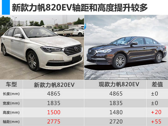 新款力帆820EV长宽高分别为4865×1835×1500mm,轴距为2775mm。与现款车型相比,高度增加20mm,轴距增加55mm。另外新车还提供两种轮毂尺寸可供选择,分别为235/45R18和215/55R17。