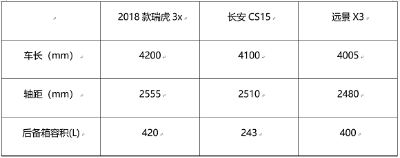 身尺寸上,2018款瑞虎3x拥有同级最长的4200mm车身长度和同级最长的2555mm轴距,并拥有同级最大420L后备箱空间,大于竞品100多mm,更大空间让乘坐更舒适,驾驶更有面。