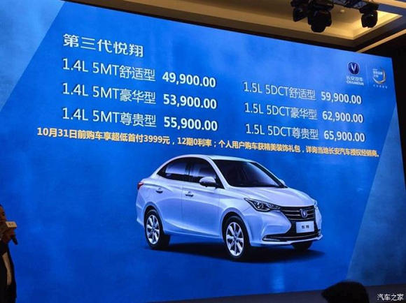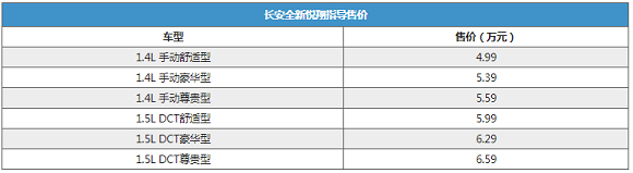 8月15日,长安全新悦翔正式上市,全新悦翔共推出搭载1.4L、1.5L两种动力共计6款车型可选,其中1.4L车型全部配备5速手动变速箱,1.5L车型则全部配备5速DCT双离合变速箱。新车指导价区间为4.99-6.59万元。详细价格请见下表: