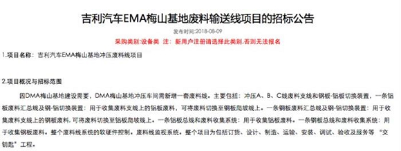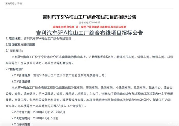 另有消息称,领克梅山工厂规划的三款车型中,将有一款代号为ES11的中大型轿车。从招标信息来看,新工厂预计将于2019年年底或2020年初投产。