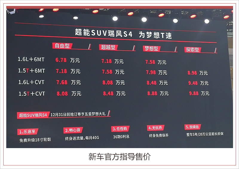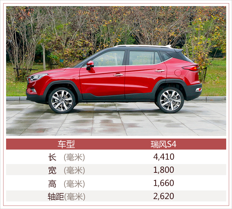 江淮瑞风S4是瑞风系列推出的第六款SUV车型,市场定位介于瑞风S3和瑞风S5之间。2018年11月16日,瑞风S4正式上市,共推出15款车型,官方指导售价为6.78-9.88万元。新车采用了瑞风家族最新的六边形进气格栅设计,搭载1.6L和1.5T两款发动机。