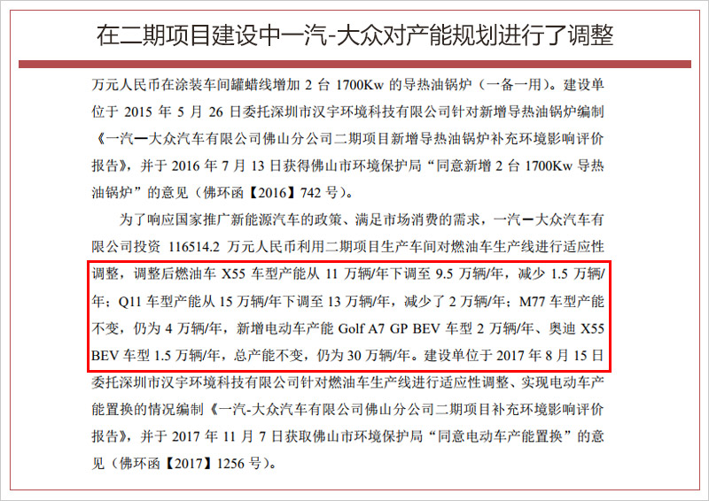 为相应国家对新能源汽车推广政策、满足市场消费需求,一汽-大众逐渐对五大生产基地进行改造。一汽-大众佛山生产基地技术改造二期项目目前已经进行环境验收,项目将现有燃油车产能置换成电动车产能,新增电动车产能Golf