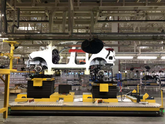 总装生产线上大量省力化设备的广泛应用让人印象深刻。总装油液加注采用集中供给方式,可实时监控加注的每个环节,提高生产效率、节省人力、物力、空间和成本,同时建立了恒温恒湿冷媒存储间,保证了加注精度。此外,底盘AGV合装,在满足SUV前后桥同步举升的同时,针对皮卡车型新开发了二次举升功能,AGV在完成车身和底盘合装任务后经过二次举升使之不经过转换吊具即能满足转运要求,在国内行业尚属首例。