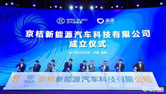 1月28日,北汽新能源与滴滴出行旗下北京小桔车服合资成立的“京桔新能源汽车科技有限公司”正式揭牌,前者出资比例为33%,后者67%。