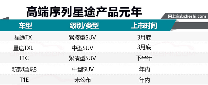 1月份的优秀表现很好地拉开了奇瑞2019年的序幕,接下来奇瑞将陆续推出多款新产品提供助力。高端序列“星途”的三款产品:TX、TXL以及T1C均将于今年推向市场,同时奇瑞品牌也将推出T1A(新款瑞虎8)、TIE两款新车。