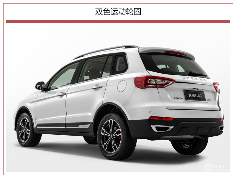 大乘G60外观设计前卫动感,前脸大尺寸横幅格栅与两侧头灯组融为一体,上方宽大的镀铬饰条内嵌DORCEN品牌徽标,极具气势。灯组采用了不规则造型,内部加入LED光源与日间行车灯,颇为精致。保险杠造型圆润饱满,雾灯区域辅以“L”型镀铬饰条点缀,极具辨识度。