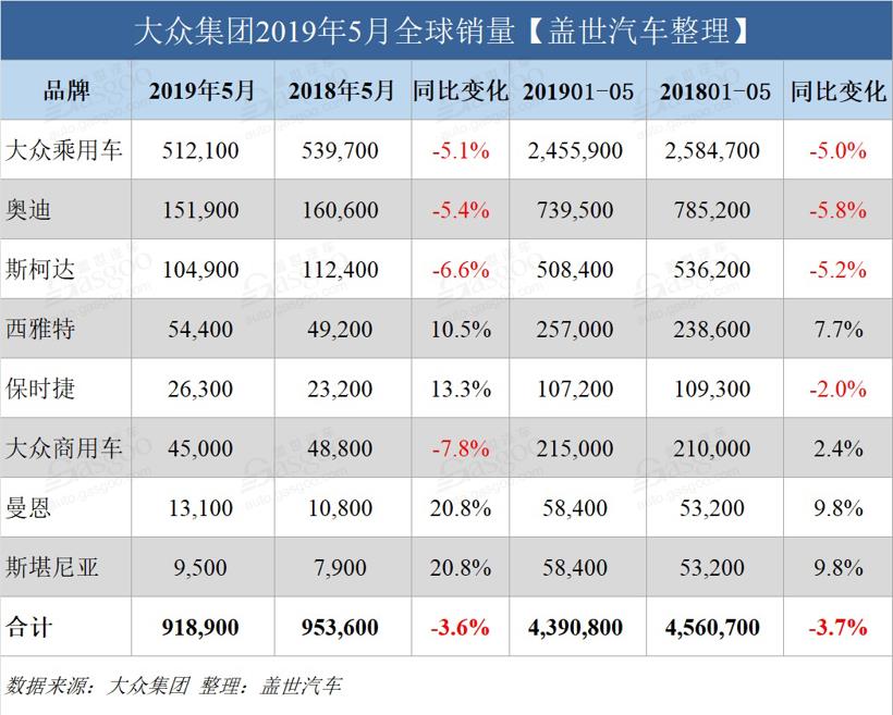 作为全球第一大汽车市场,车企在中国市场的表现在很大程度上决定了车企的地区和全球销量。大众集团在华的跌幅,导致其在亚太的销量同比下降9.4%。此外,虽然大众集团5月份在德国、法国、意大利等欧洲市场和美洲市场实现了不同程度的增长,但是从集团的全球销量来看,大众集团5月销量依然没能实现同比增长,同比跌幅为3.6%,总交付量为918,900辆。截至5月底,大众集团2019年累计销量也出行了3.7%的跌幅。