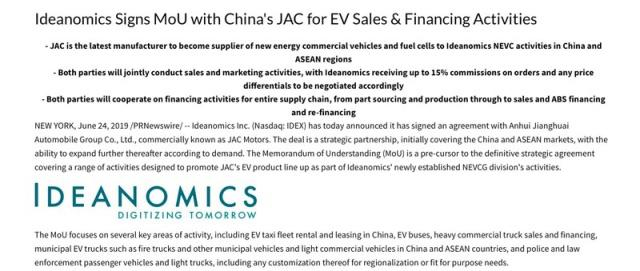 近日,Ideanomics Inc.(IDEX)宣布与江淮汽车签订协议,江淮汽车将作为Ideanomics新成立的NEVC部门在中国和东盟地区的新能源商用车和燃料电池供应商。同时,双方将共同开展销售和营销活动,Ideanomics将获得高达15%的订单佣金和相应的差异协商价格。双方还将在零部件采购、生产、销售、ABS融资及再融资等供应链所有环节上进行金融合作。