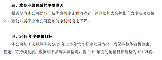 长城汽车半年的销量快报中表示,基于宏观经济及2019年上半年汽车行业发展情况,为保持整体销售健康、稳定、可持续发展,根据旗下品牌实际情况,将2019年度的销量目标下调11%,为107万辆。