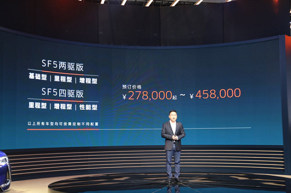 动力方面,SF5纯电动版车型最大功率可达510kW,最大扭矩达到1040Nm,其0-100km/h加速时间为3.5秒,NEDC工况续航里程可达500km。增程版将配备OBC与V2V互充系统,既可为家电提供电源也可为其他电动车提供充电服务。