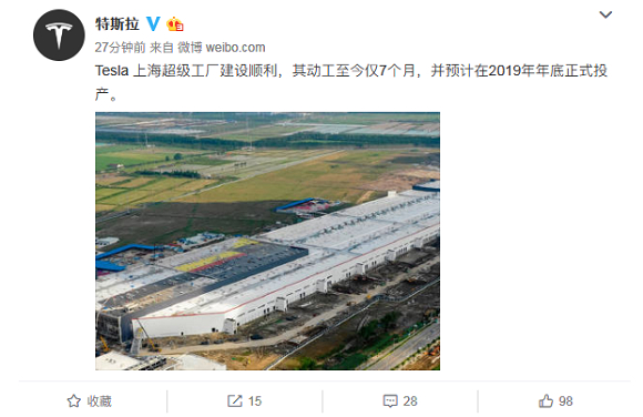 8月7日,特斯拉官方微博宣布,特斯拉上海超级工厂建设顺利,其动工至今仅7个月,并预计在2019年年底正式投产。