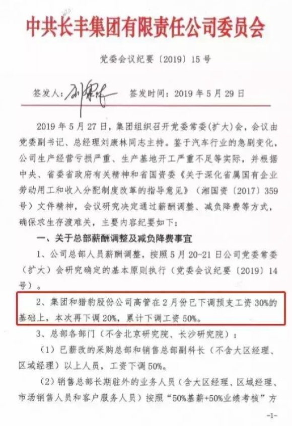 从一份于5月29日印发的内部会议纪要文件显示,长丰集团决议执行“员工薪酬调整及减负降薪”。文件内容表示,鉴于汽车行业的急剧变化,公司生产经营亏损严重,生产基地开工严重不足等,会议通过薪酬调整、减负降薪等方式,确保求生存渡难关。