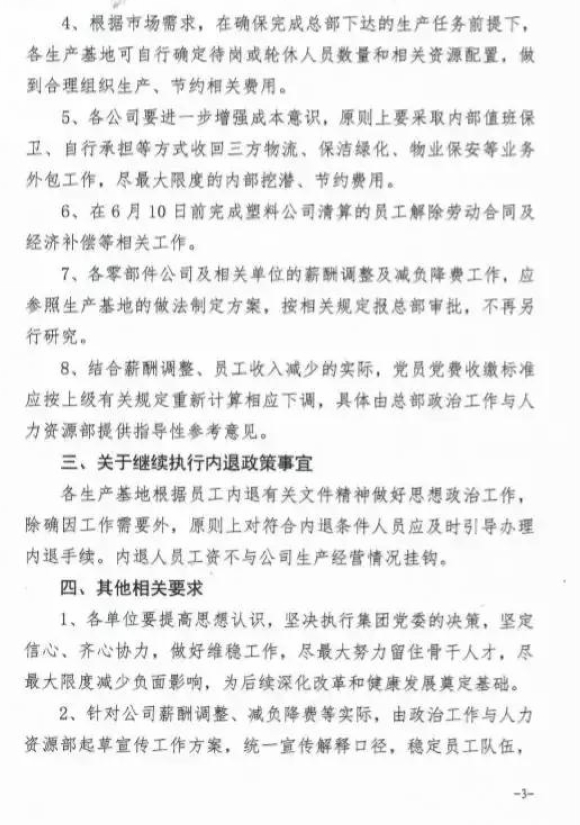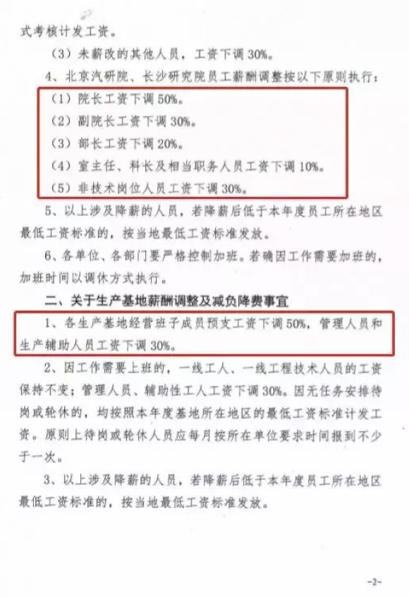 薪酬调整包括总部部分高管下调工资50%,研究院员工工资下调10%-50%,生产基地员工工资下调30%-50%。