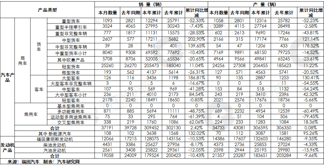 福田汽车7月汽车销量3.72万辆 同比降6.39%