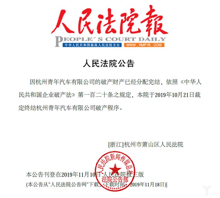 11月10日,杭州市萧山区人民法院发布公告表示,因杭州青年汽车有限公司(以下简称“青年汽车”)的破产财产已经分配完结,依照《中华人民共和国企业破产法》第一百二十条之规定,已于2019年10月21日裁定终结其破产程序。