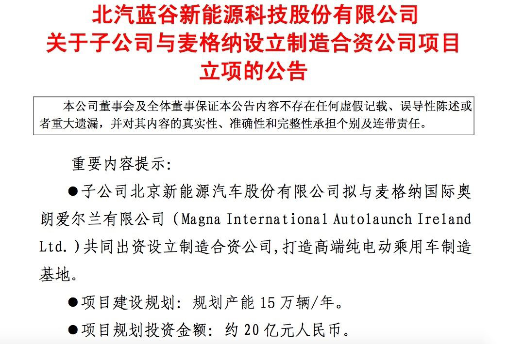 12月2日,北汽蓝谷发布公告称,公司将通过子公司北汽新能源的子公司卫蓝投资与麦格纳国际奥朗爱尔兰有限公司(以下简称“麦格纳爱尔兰”)共同打造具有成本优势和技术创新能力的纯电动乘用车制造合资公司。