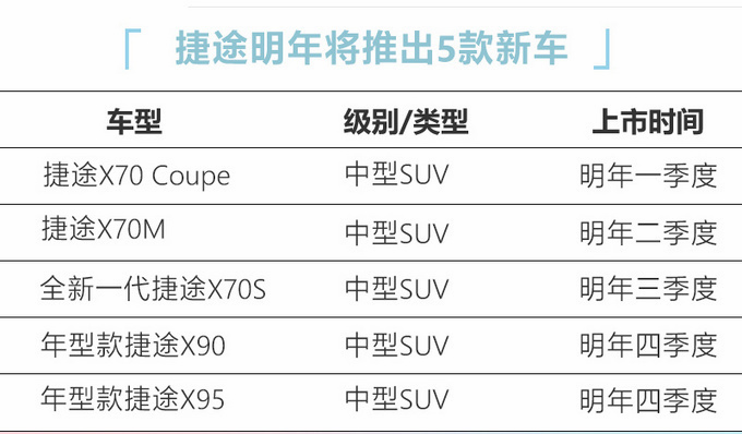 新产品方面,捷途今年将推出X70 Coupe、X70M、新X70S,以及X90/X95的年款车在内的5款车型。不难看出,捷途的产品策略目前正以走量产品X70为核心,衍生出多个针对细分市场的车型,其中X70 Coupe定位轿跑SUV,X70M价格进一步,主打定位更入门的家用SUV市场。