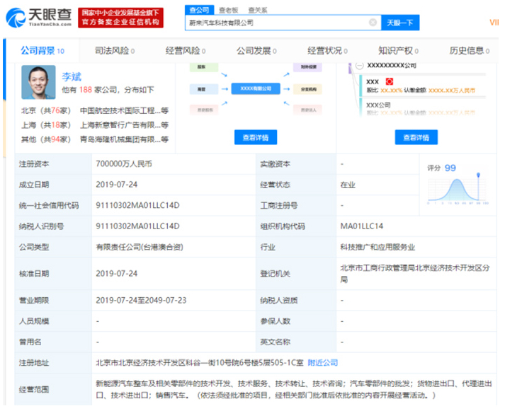 蔚来汽车成立科技有限公司 注册资本70亿元