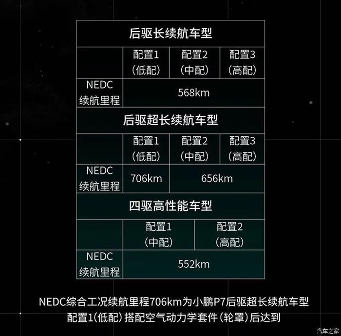 小鹏汽车P7早在2019年就已开启预售,后驱长续航版、后驱超长续航版以及四驱高性能版的预售价分别为24万元、27万元以及37万元。新车续航表现是一大亮点,四驱高性能版车型的续航最短,但其NEDC续航里程也达到了552km,而后驱超长续航版车型的NEDC续航更是达到了706km(配备轮罩后达到)。