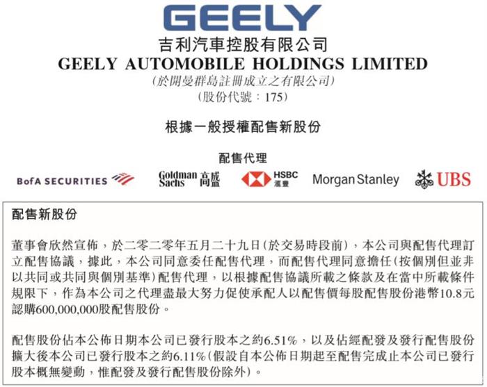 为了应对车市不确定的挑战,吉利汽车希望筹集更多资金以备不时之需。5月29日,吉利汽车发布公告,公司(作为发行人)与配售代理订立配售协议,据此,配售代理同意作为公司的代理尽最大努力促使承配人以配售价每股配售股份港币10.8元认购6亿股配售股份。