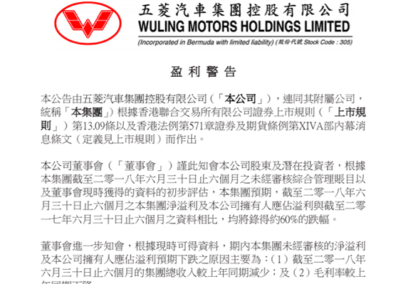 五菱汽车日前发布盈利警告,预期截至今年6月底止六个月净溢利及溢利,按年均将录得约60%的跌幅,主要原因为期内总收入按年减少及毛利率按年下降。 [详细]