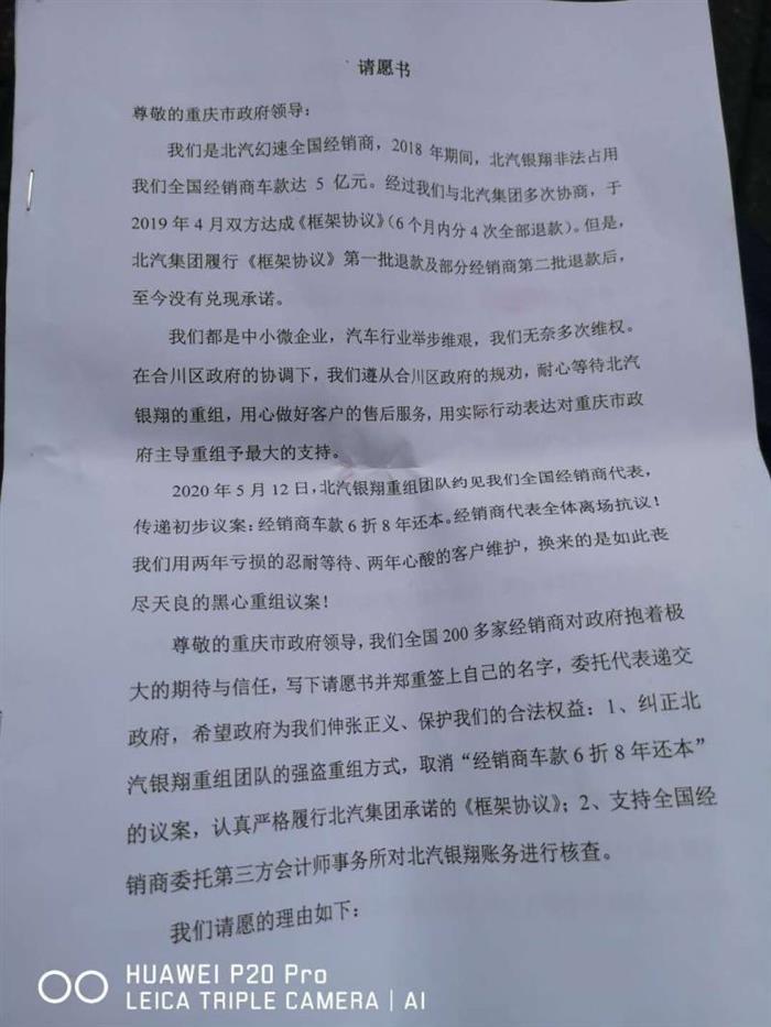 据悉,6月24日北汽幻速经销商已向重庆市政府提交了请愿书,诉求一是取消经销商车款6折8年还本的议案,认真严格履行北汽集团承诺的《框架协议》;二是支持全国经销商委托第三方会计师事务所对北汽银翔账务进行核查。