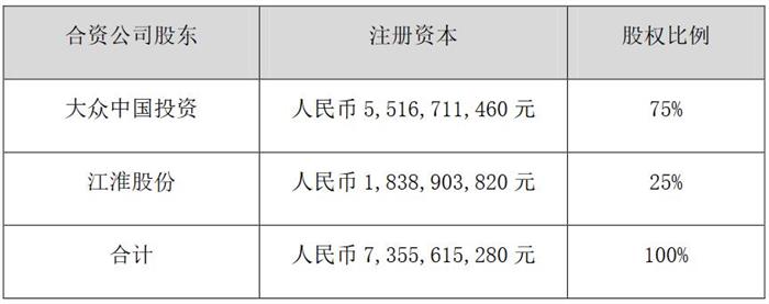 其中,江淮汽车方面向江淮大众增资1,284,908,578元,持有合资公司25%股权;大众中国投资向江淮大众增资5,216,711,460元,将持有合资公司75%的股权。