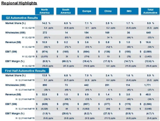 受疫情影响,福特在其经营的全球范围内每个地区都出现亏损,其中在欧洲亏损6.64亿美元,在中国亏损1.36亿美元。福特信贷本季度实现利润5亿美元,但低于2019年第二季度的8亿美元。