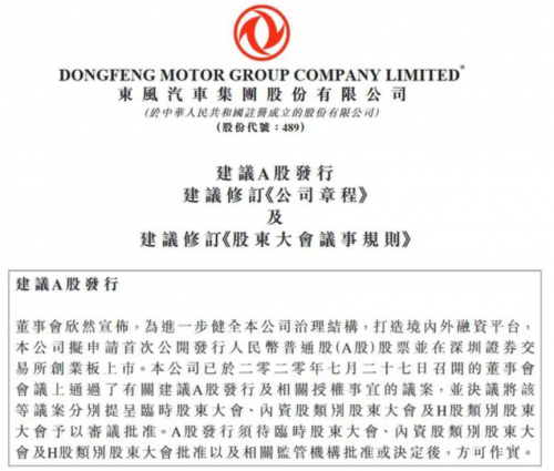 7月27日,东风汽车集团股份有限公司披露公告称,为进一步健全公司治理结构,打造境内外融资平台,计划申请首次公开发行人民币普通股(A股)股票,并在深圳证券交易所创业板上市。公司将召开临时股东大会、内资股类别股东大会及H股类别股东大会,以寻求批准该议案。